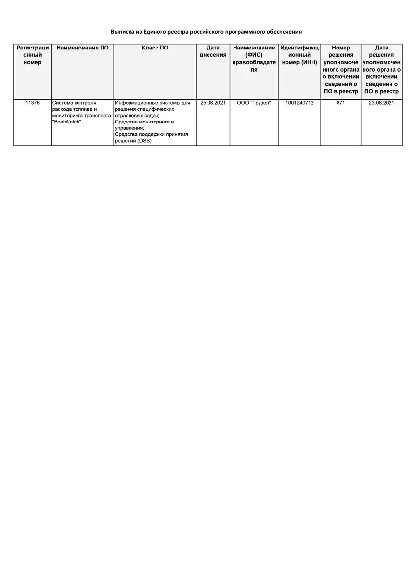 Выписка из Реестра российского програмного обеспечения Boatwatch №11376 от 25.08.2021